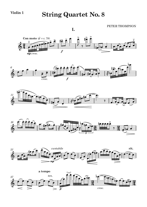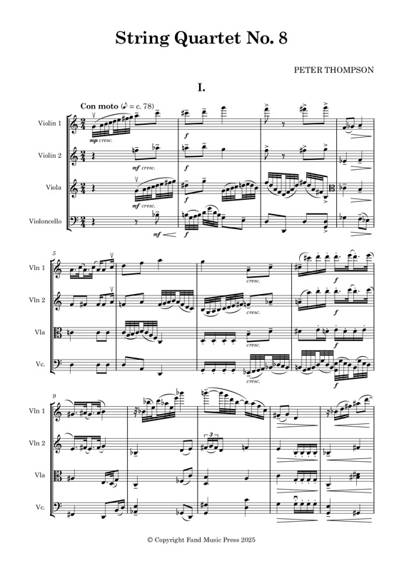 | Peter Thompson | (Play complete work)String Quartet no 8 (score and parts) | Two Violins, Viola, ’Cello | 11 mins | |||